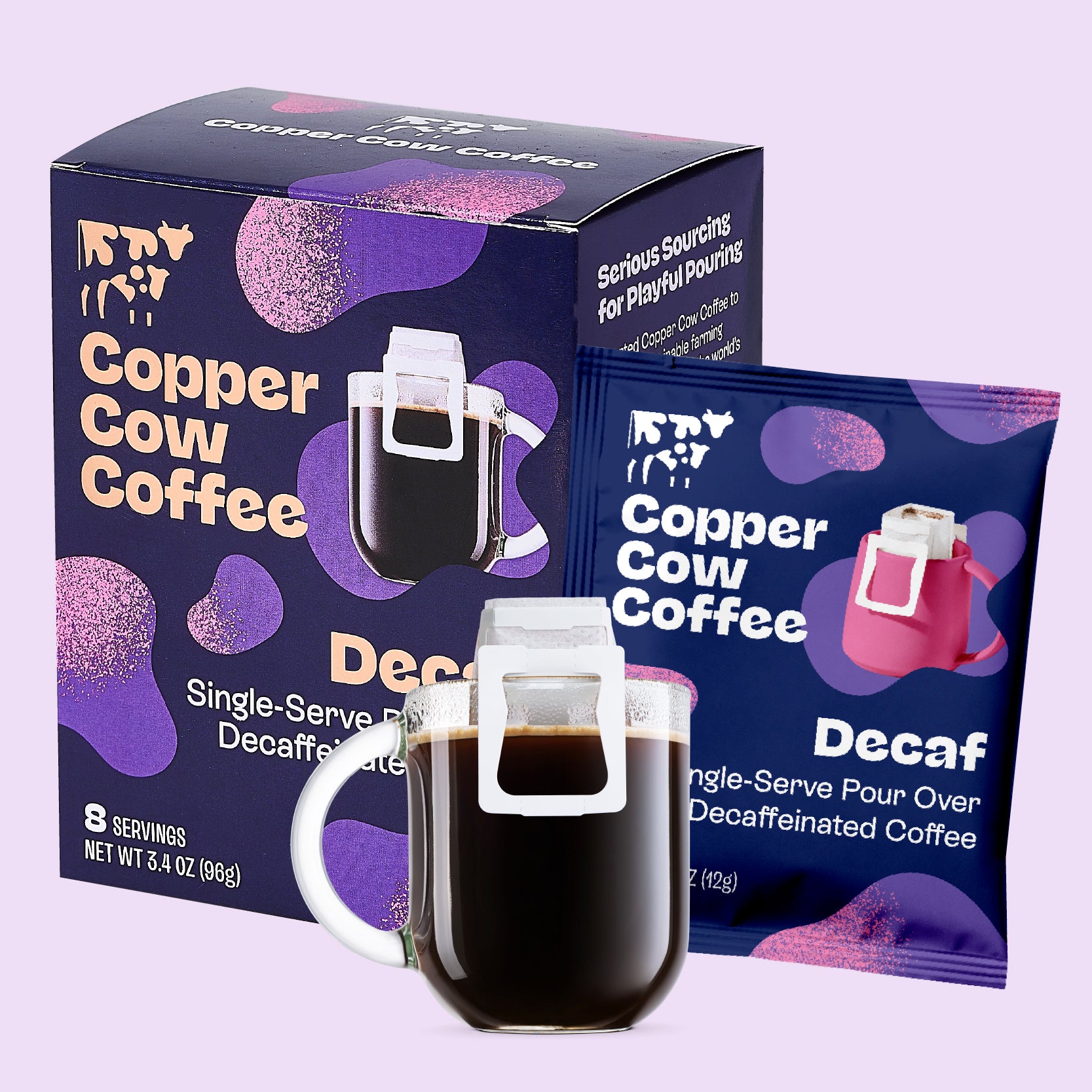 Copper Cow Coffee Decaf single-serve pour over packaging on a beige background