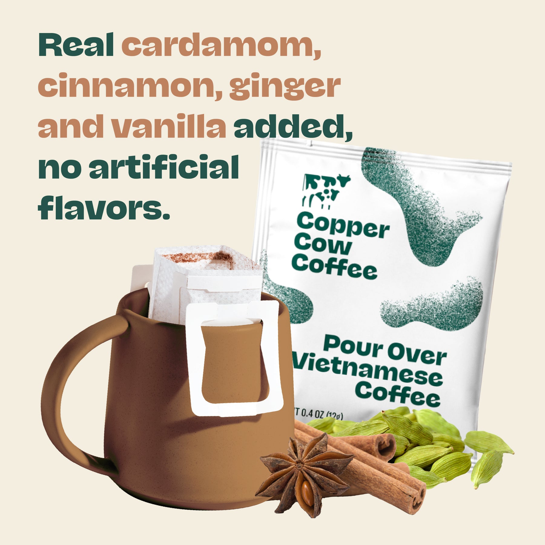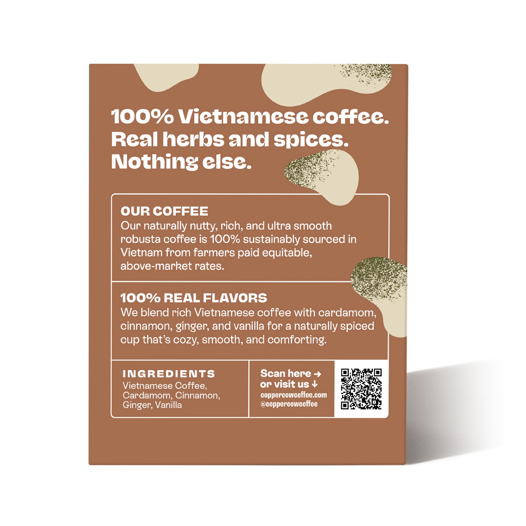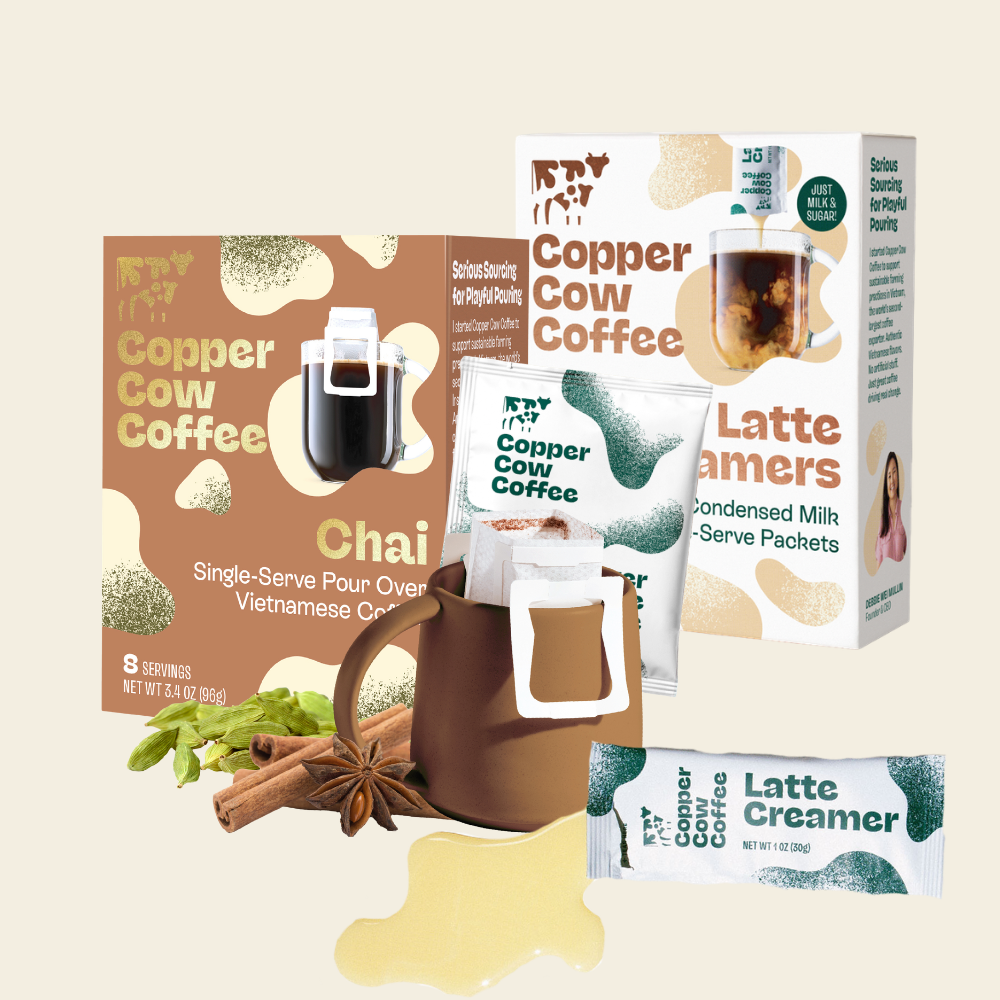 We blend bold Vietnamese robusta with warming cinnamon, fragrant cardamom, lively ginger, and a hint of vanilla for a rich, spiced brew that tastes like your favorite chai latte, only deeper and coffee-forward.